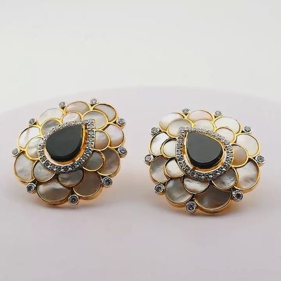 Soft mother-of-pearl petals, a bold onyx center, and a sparkling diamond halo—these floral studs are full of thoughtful details and timeless charm.